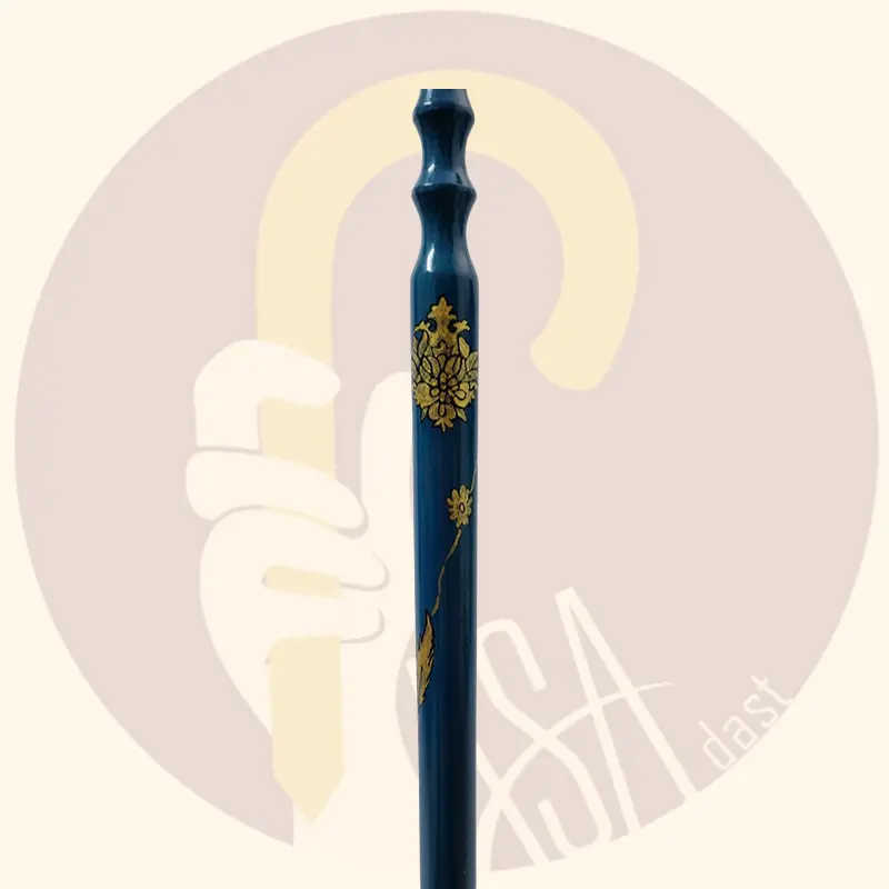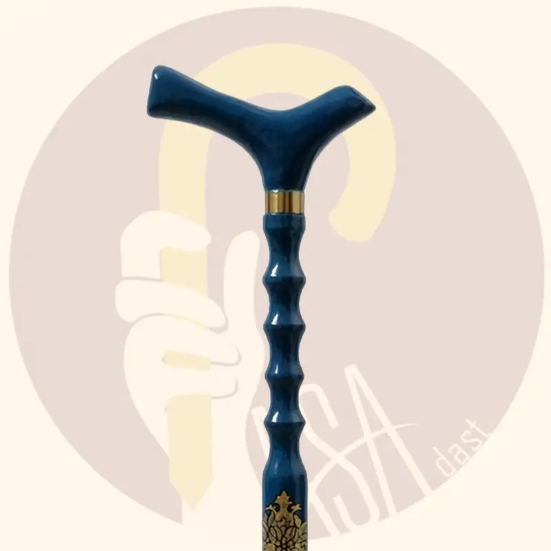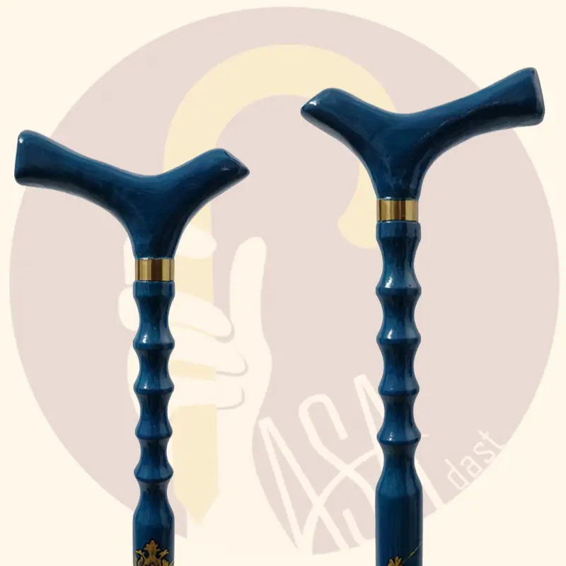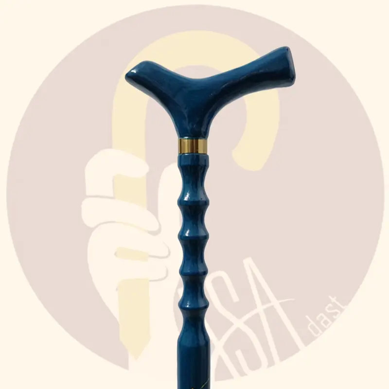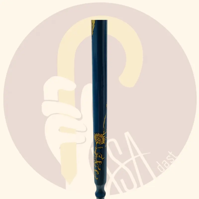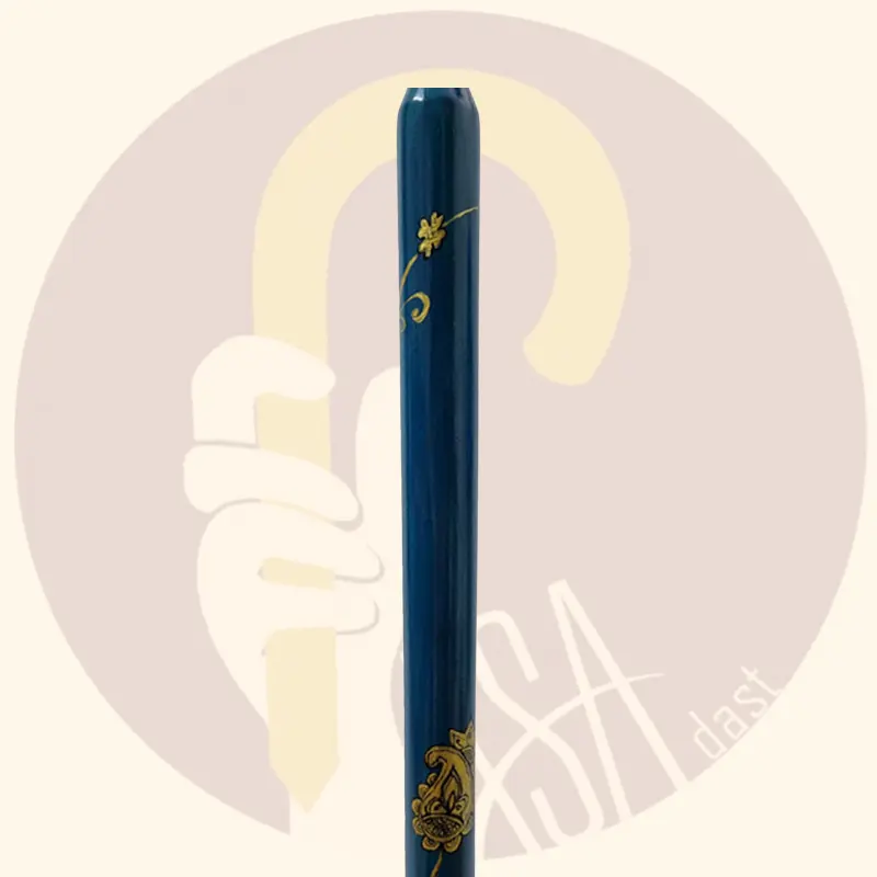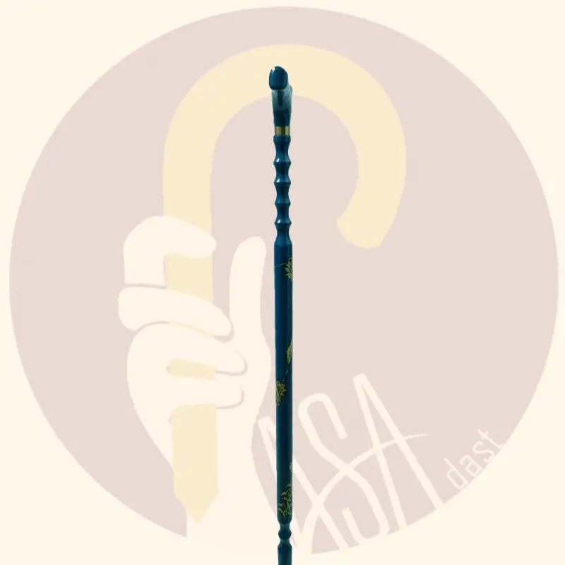 The cane has a deep teal (turquoise) body, with yellow-painted decorative patterns, creating a visually striking contrast
